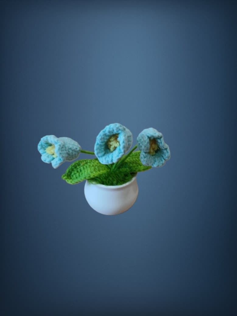 Precio, información, características e imágenes de Planta con tarro blanco 3 flores azules hecha a mano a ganchillo (amigurumi). pertenece a la categoría Planta y flores (54).
